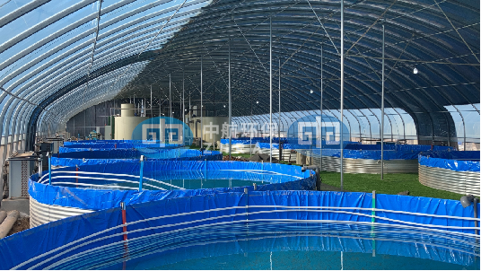 【新疆养殖基地的 ZH-RAS 系统车间 —— 模块化池体布局,适配低温环境下的规模化淡水鱼养殖。】