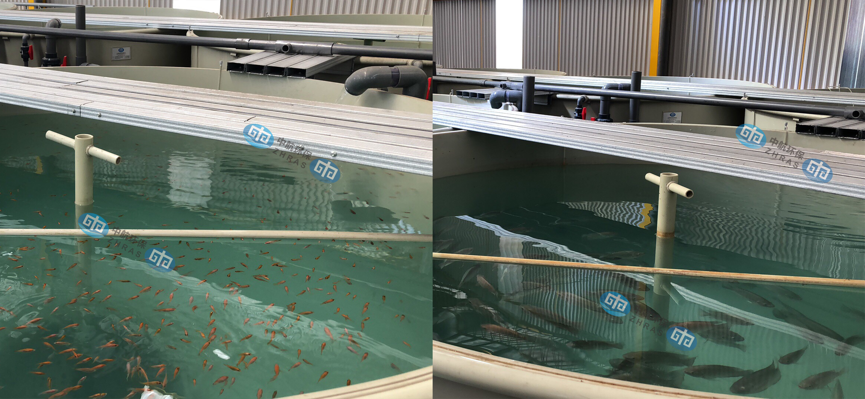 ZH-RAS20 系统下的罗非鱼幼苗(左)与成鱼(右)生长状态