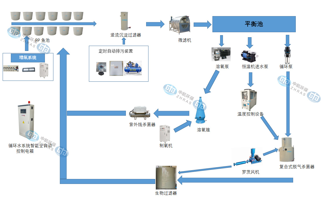 ZH-RAS20 采用全闭环智能水处理流程,实现养殖水的高效循环与净化:平衡池 → 全自动微滤机 → 循环泵 → 蛋白质分离器 → 臭氧一体机 → 残余臭氧去除器 → 生物过滤器 → 复合式脱气杀菌处理器 → 温度控制 → 水质监测 → 养殖鱼池